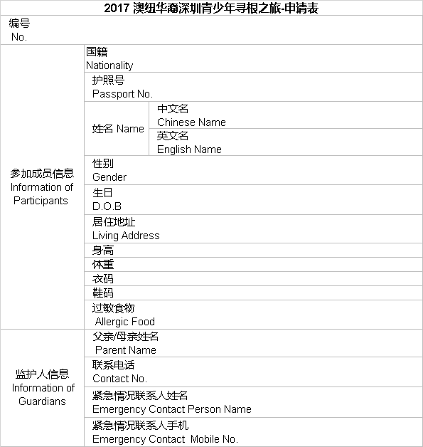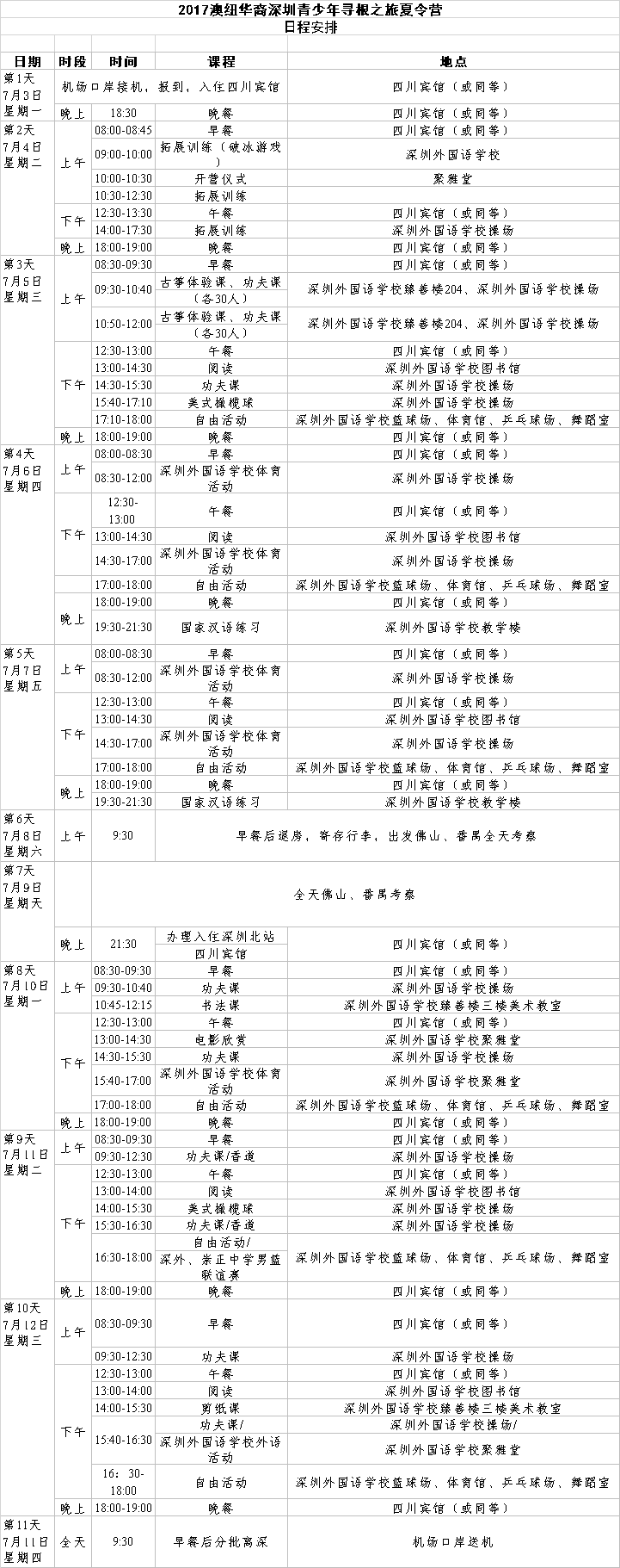 好消息!好消息!由深圳市侨办、侨联主办,由深圳市外国语学校、澳洲深圳同乡会、新西兰深圳联谊总会和澳洲深圳同乡联谊会暨总商会(西澳)的《2017年澳纽华裔青少年“中国寻根之旅”夏令营》“学习中国文化,架起友谊桥梁”正在热烈招募中:欢迎12-20岁生活在澳纽的 “深二代”学生积极参与。时间为7月3日至7月13日为期11天,费用:除了来回国际机票自付外,其他费用由深圳市侨办 侨联承担,具体行程安排参考附表。