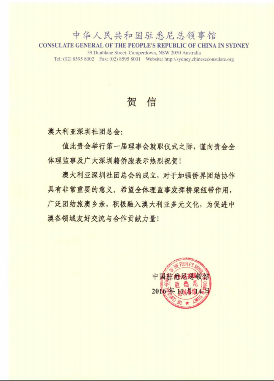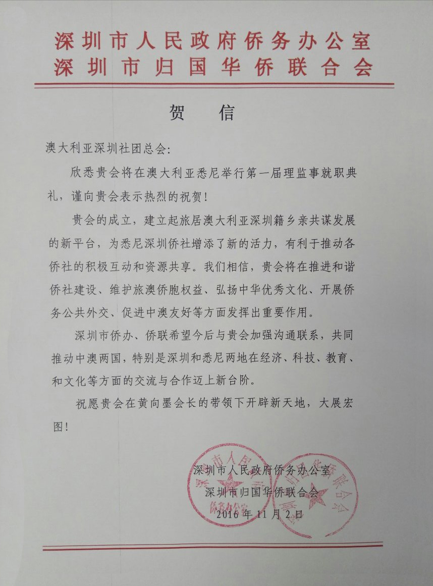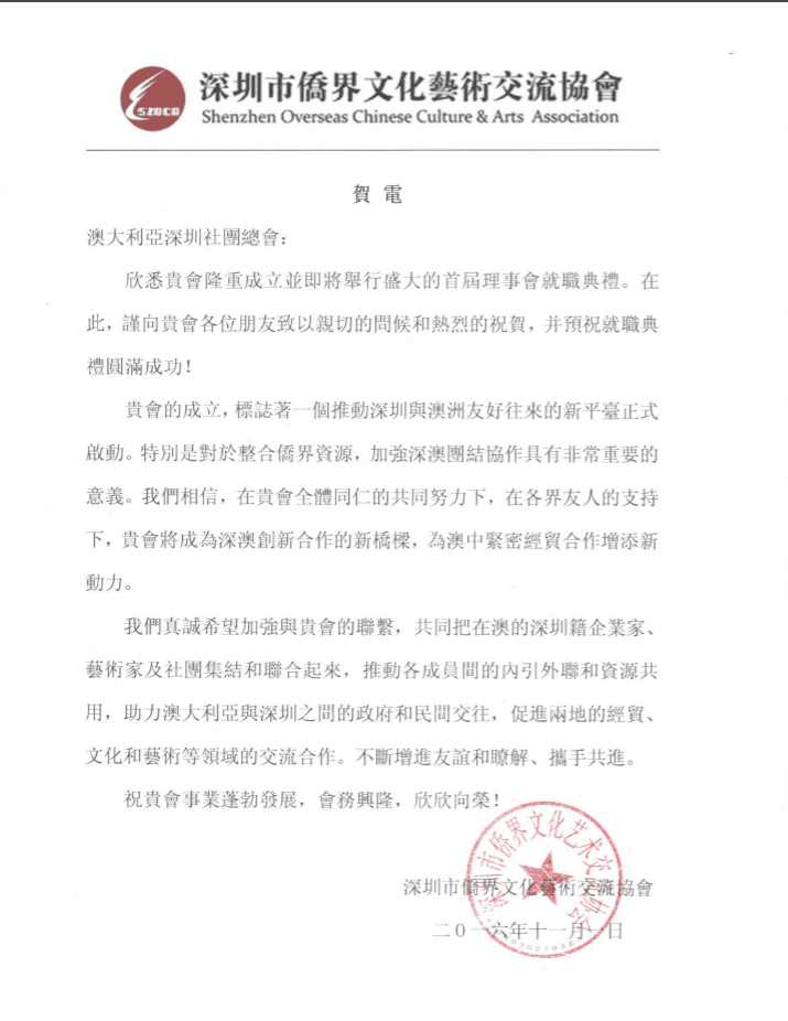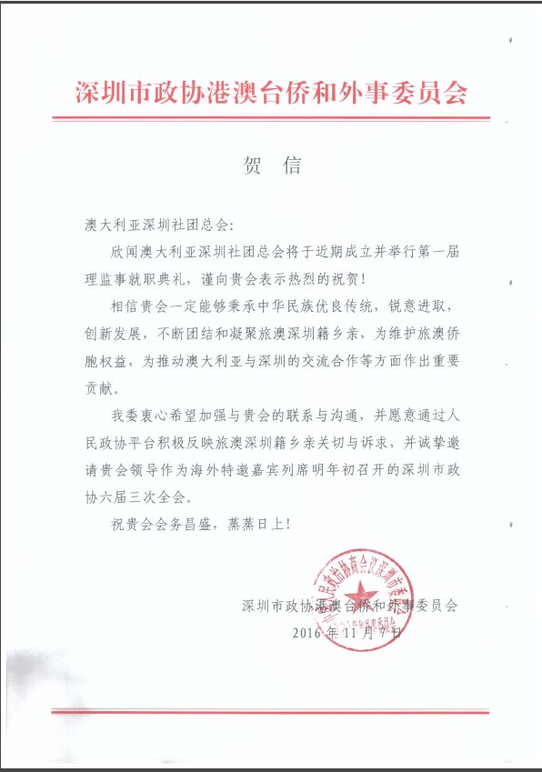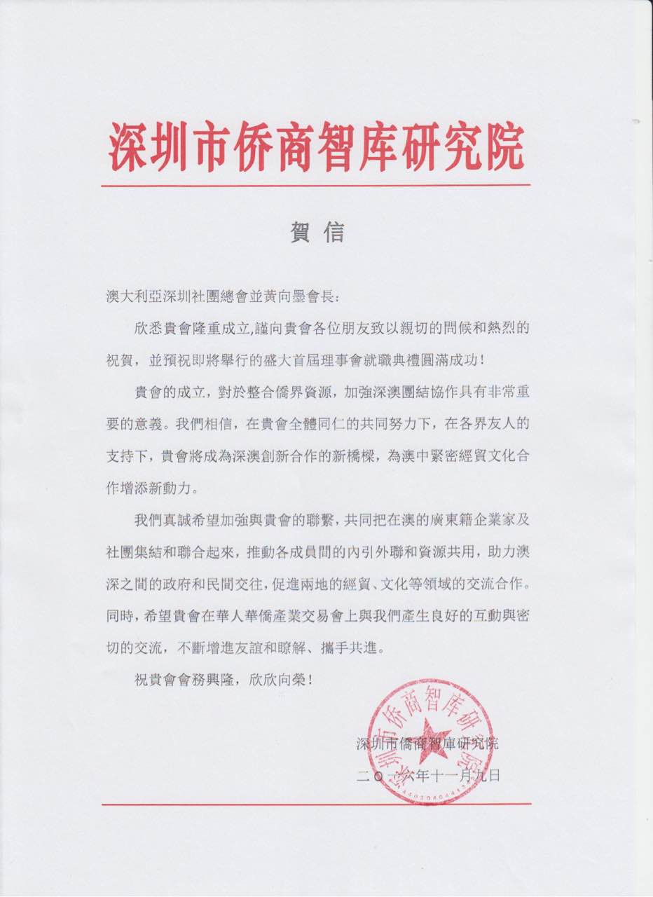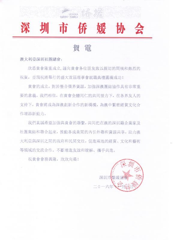 贺澳大利亚深圳社团总会成立贺信