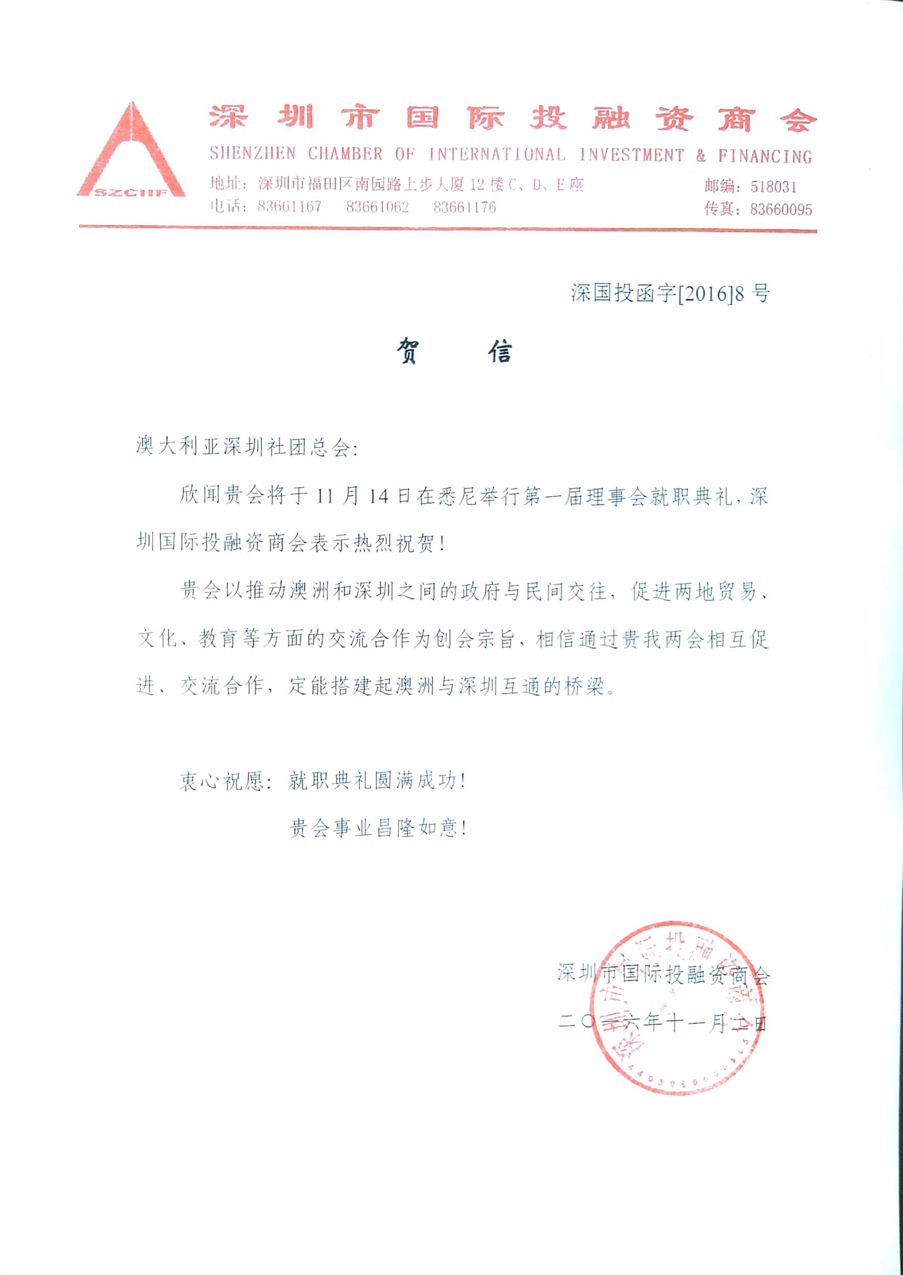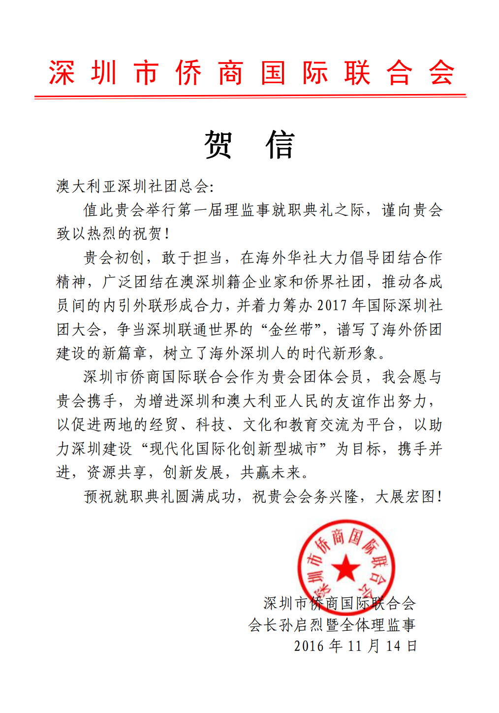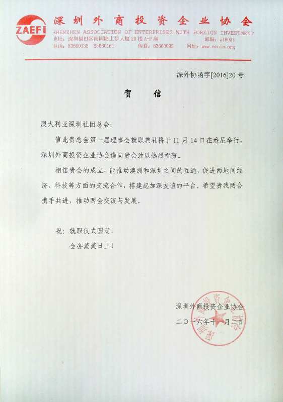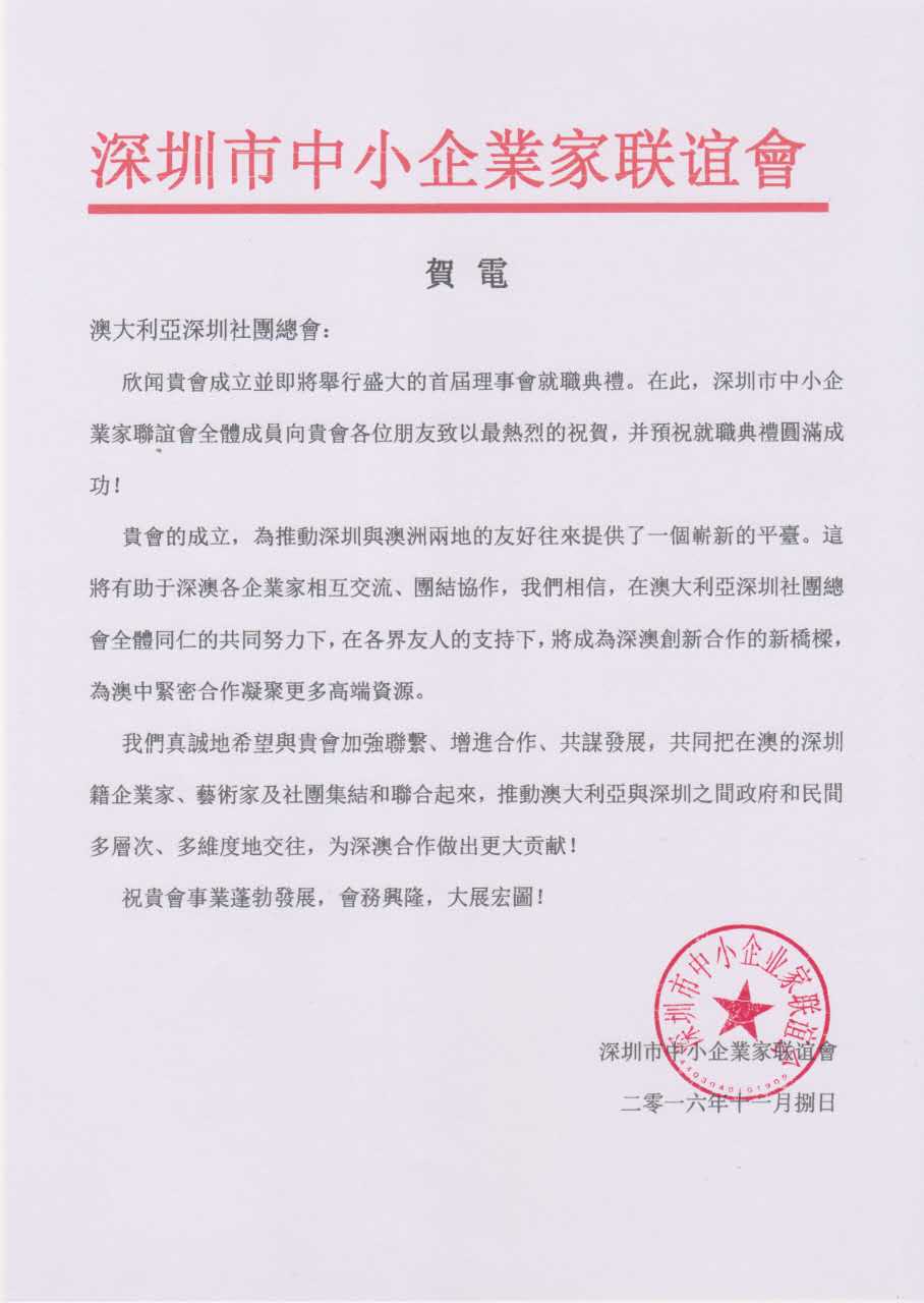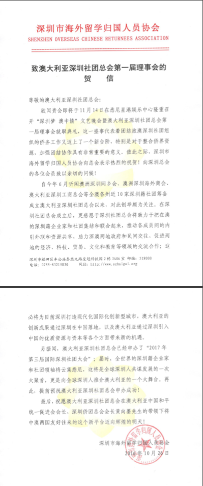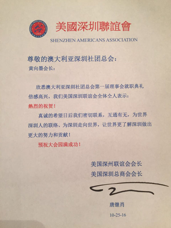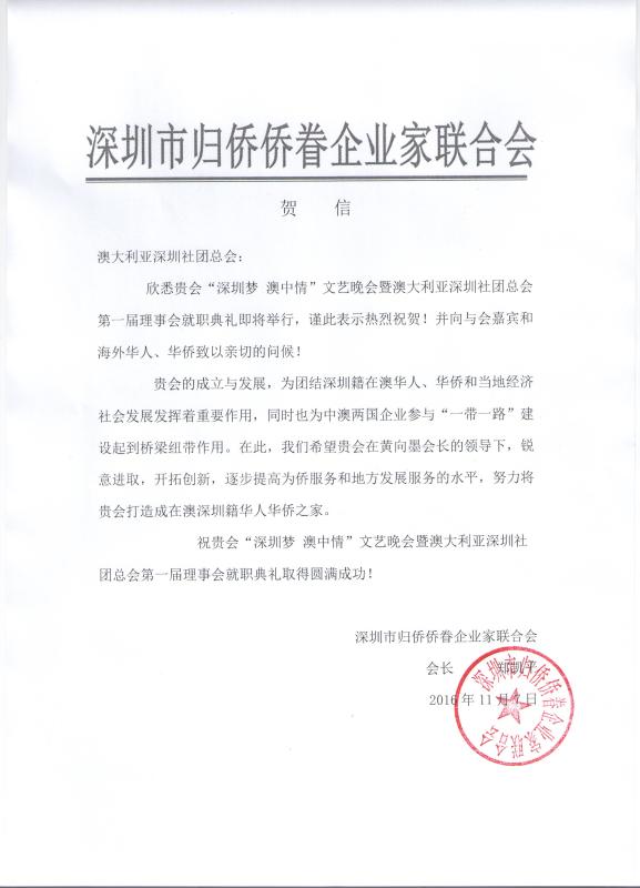 贺澳大利亚深圳社团总会成立贺信